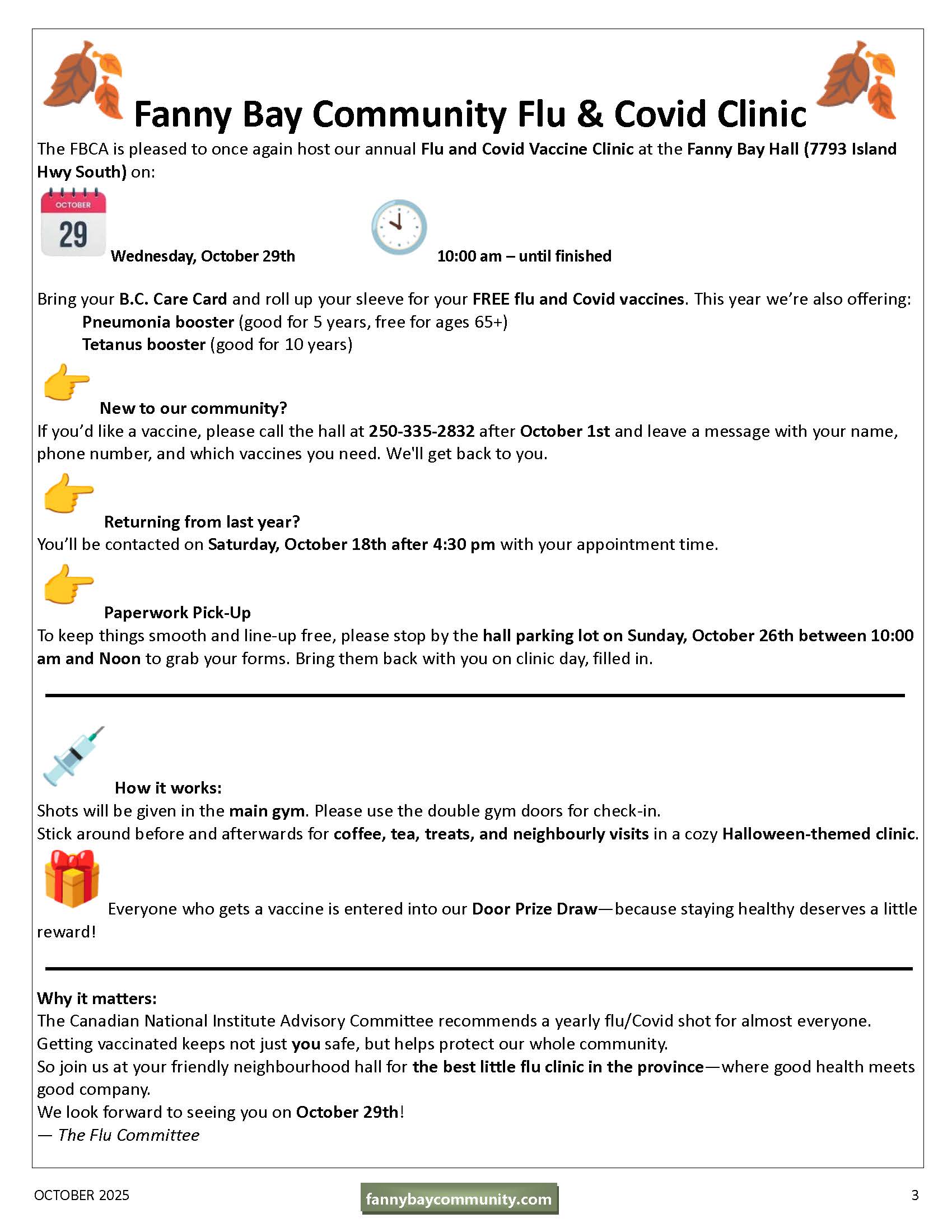 Bring your B.C. Care Card and roll up your sleeve for your FREE flu and Covid vaccines. This year we’re also offering: Pneumonia booster (good for 5 years, free for ages 65+) Tetanus booster (good for 10 years) New to our community? If you’d like a vaccine, please call the hall at 250-335-2832 after October […] |